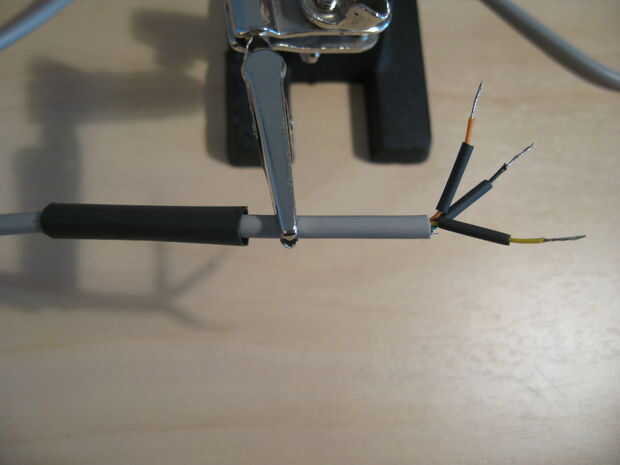 9) Deslice un tubo retráctil sobre el cable. Deslice tres pequeños tubos de contracción sobre los alambres individuales.