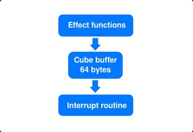 No utilizamos ninguna sincronización o doble búfer, ya que existe sólo un productor (ya sea los efectos actualmente en ejecución, o entrada de RS232) y un consumidor (el interrupción-código que actualiza el cubo). Esto significa que algunos voxels podría ser la siguiente o anterior "marco", pero esto no es un problema, puesto que la velocidad de fotogramas es tan alta.