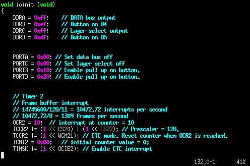 Todos los puertos IO en el ATmega son bidireccionales. Pueden ser utilizados como una entrada o una salida. Configuramos todo como salidas, excepto las clavijas de IO que se conectan los dos botones. El pin RX de la línea serial se convierte automáticamente en una entrada cuando se activa los RX de la USART.