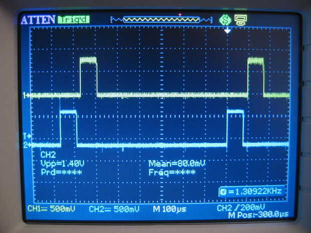 Utilizamos Timer2 con un prescaler de 128 y un valor de comparar la salida de 10. Esto significa que el contador se incrementa en 1 para cada ciclo de cpu 128. Cuando Timer2 llega a 10, se resetea a 0 y se llama la rutina de interrupción. Con una frecuencia de 14745600 Hz, 128 prescaler y salida compara de 10, la rutina de interrupción se llama cada ciclo 1408th de la CPU (128 * 11) o 10472,7 veces por segundo. Muestra una capa a la vez, por lo que toma 8 carreras de la interrupción para dibujar el cubo entero una vez. Esto nos da una tasa de refresco de 1309 FPS (10472.7/8). A este ritmo de actualización, el cubo del LED es parpadeo 100% gratis. Algunos podrían decir que 1300 FPS es excesiva, pero la rutina de interrupción es bastante eficiente. A este ritmo de actualización alto, sólo utiliza aproximadamente el 21% del tiempo de CPU. Podemos medir esta conectando un osciloscopio a la línea de habilitación de salida (OE). Esto se tira alto en el inicio de cada interrupción y bajo al final, así que da una indicación bastante buena de tiempo dentro de la rutina de interrupción.