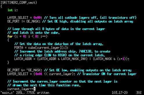 Cada vez que se ejecuta esta interrupción, el cubo se borra datos de la nueva capa se cargan en la matriz de cierre y la nueva capa está encendida. Esto sigue siendo en hasta la próxima vez los funcionamientos de la interrupción, donde el cubo es despejó otra vez, datos para la siguiente capa se cargan en la matriz de cierre, y la capa siguiente está encendida.
