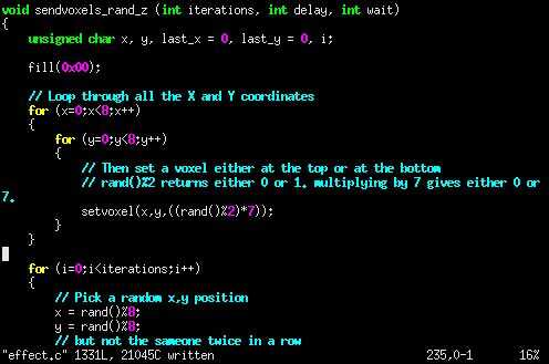 sendvoxels_rand_z() vacío toma tres argumentos. Iteraciones es el número de veces que un voxel es enviado hacia arriba o hacia abajo. Demora es la velocidad del movimiento (mayor retardo, velocidad inferior). Esperar es el retardo entre cada voxel que se envía.