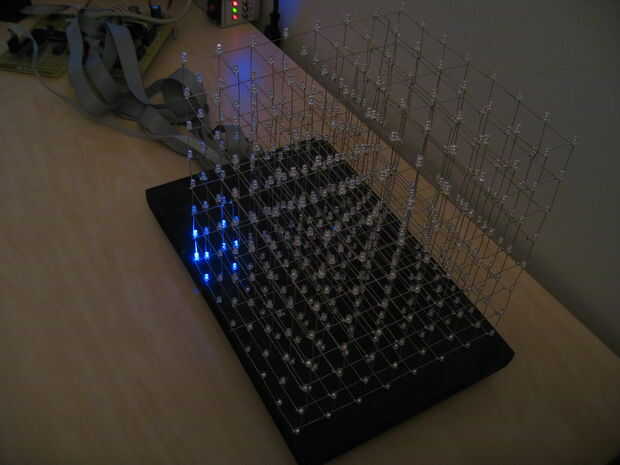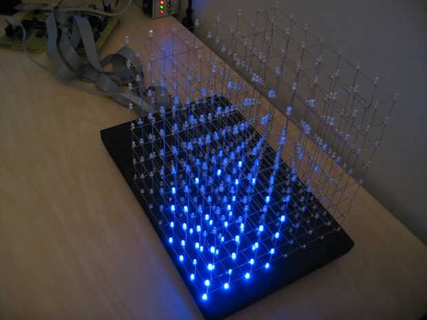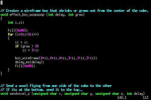 Hicimos dos funciones de animación de cuadro por el cubo del LED. Effect_box_shrink_grow() dibuja una caja de estructura metálica llenar el cubo entero, luego disminuye hasta un voxel en una de las 8 esquinas. Llamamos a esta función una vez para cada una de las 8 esquinas para crear un efecto agradable. Effect_box_woopwoop() dibuja un cuadro que comienza como una 8 x 8 x 8 caja de alambre relleno el cubo entero. Luego se contrae hasta un 2 x 2 x 2 caja en el centro del cubo. O en revés si se especifica.