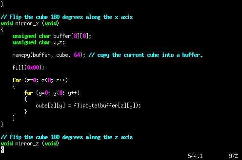 Para hacer la función tan simple como sea posible, simplemente dibuja una caja de 0,0,0 a cualquier punto a lo largo de la diagonal entre 0,0,0 y 7,7,7 luego utiliza las funciones de espejo de eje de draw.c para girarla.