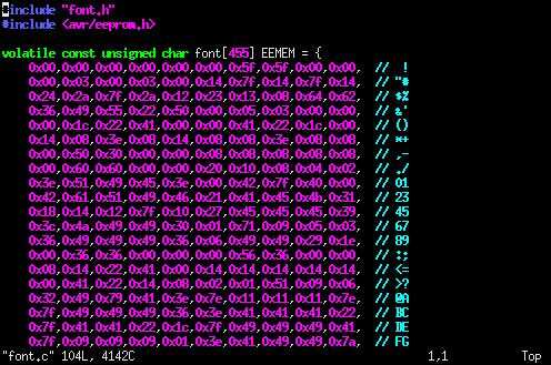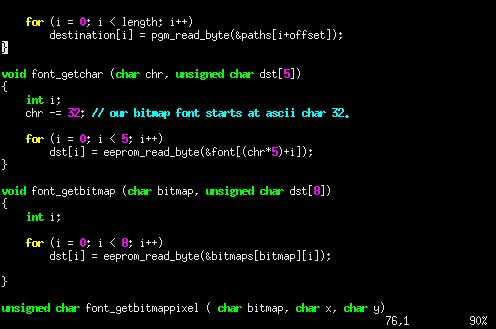 Nos carga una fuente de mapa de bits de 8 x 5, que previamente habíamos utilizado con una pantalla gráfica en la memoria EEPROM y creó algunas funciones que tuvo a un carácter de ASCII como argumento y devuelve un mapa de bits del carácter.