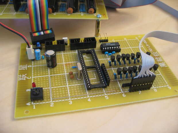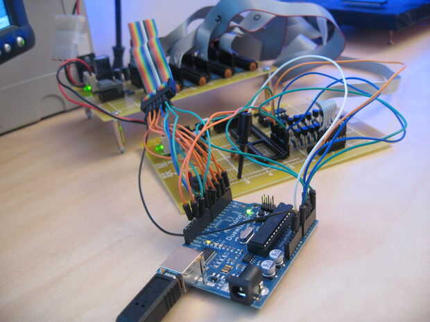 Desde la Junta AVR y matriz multiplexor están separados por un cable de cinta, conectar las líneas de IO a un Arduino es una simple cuestión de conectar algunos cables de protoboard. Por suerte, soldar en una mujer 0,1" jefe del pin de las líneas de transistor cuando fuimos depurando el primer conjunto de transistores. Sólo Retire el ATmega y conecte los cables de la Arduino a estas cabeceras de pin.