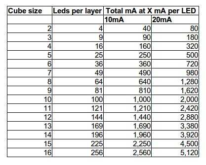 Tenga en cuenta que la cantidad de puertos IO aumentará exponencialmente. Así será el número de LEDs. Puede ver una lista de requerimientos de pin IO para tamaños de cubo diferentes en la tabla 1.
