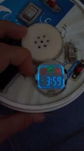Se trataba de un reloj se rompió la rama en un almacén del dólar y su correa, he añadido un altavoz para reforzar el volumen de la alarma del reloj. Esto también se ilumina como se ve en la segunda foto.