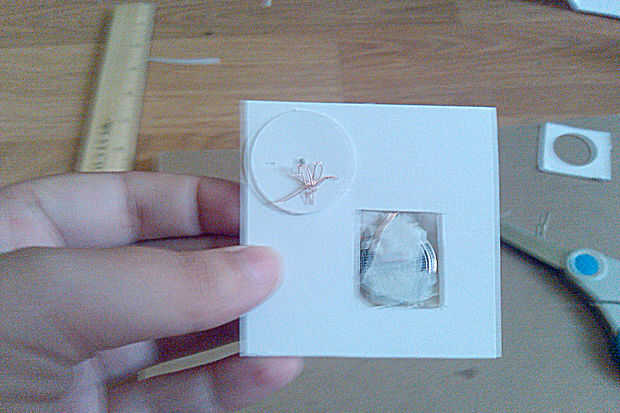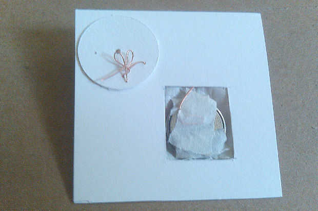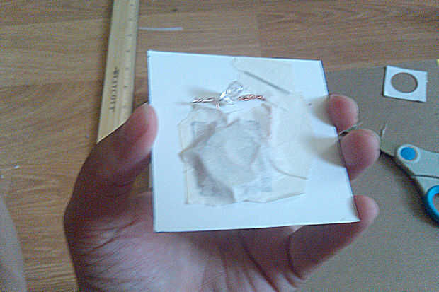 Coloque el círculo en la esquina superior derecha de la pieza de 2.5x2.5inch de papel. Si desea, puede trazar un esquema, para recordar donde está. Utilizando un pin, hágale un agujero donde está el centro del círculo. Debe haber un agujero en el círculo y el papel detrás de él. Luego meter 4 agujeros, como los puntos de una pequeña plaza, debajo del alambre de cobre en el círculo. Raya dos trozos de alambre totalmente, por lo que no hay aislamiento en él en todo. Ejecutar un cable a través de dos de los cuatro orificios, y el otro alambre a través de los otros dos agujeros el alambre debe crear dos líneas perpendiculares al cable en el círculo, para que cuando el círculo gira, en el círculo va a crear un contacto entre los dos cables en el papel por debajo. Una vez que tengas todos los cables establecidos, debe empujar el pasador a través del círculo y el papel detrás de él, para que la cabeza del perno se presiona firmemente contra el centro del círculo. La espiga más corta con el cortador de alambre de clip y con los alicates de punta, doble el pasador para que la cabeza presiona ras contra la parte superior del círculo, y el otro extremo del perno se presiona firmemente en la parte posterior del papel detrás del círculo. La parte posterior del perno en lugar de cinta.