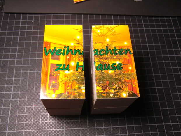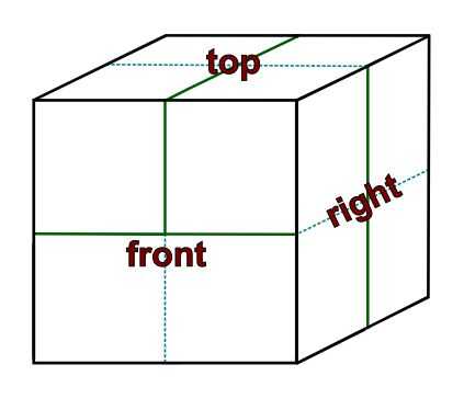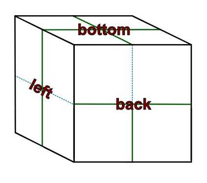 Vamos a empezar con la parte exterior del cubo. Se necesita 6 de las fotos cuadradas. La segunda imagen muestra, cómo cortar las fotos para la tapa, frente y derecha (corte a lo largo de las líneas verdes y doble a lo largo de las líneas azules). Después de que corte los pegarán en el cubo. Ahora gire el cubo para que el frente es en la parte trasera y la tapa en la parte inferior. Corte las imágenes de la parte trasera, izquierda y como se muestra en la cuarta foto y pegarlas sobre el cubo.