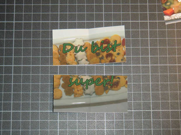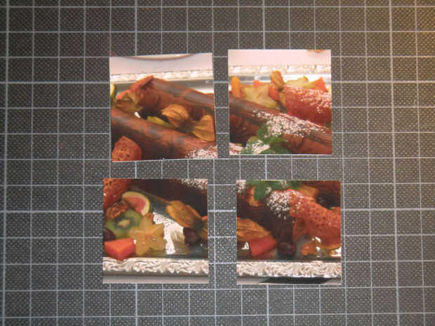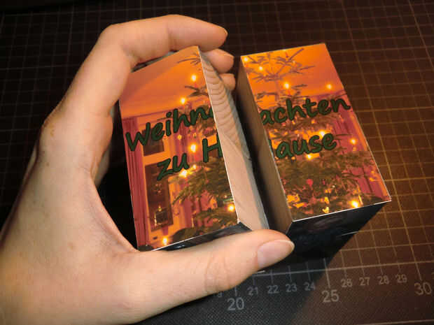 Para el centro necesita una imagen que tiene de longitud de 4 cubos y la altura de los dos. Cortar y doblar como se muestra en la segunda foto y pegarlo sobre los cubos.