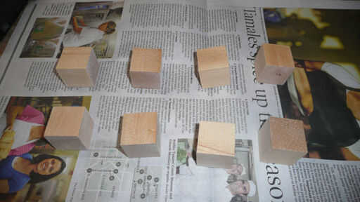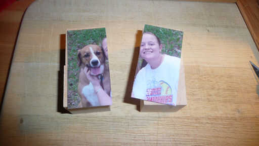 Empecé por encontrar fotos que quería usar y ponerlos en photoshop para redimensionar al tamaño exacto de los bloques e impreso en papel fotográfico. Planeé simplemente cubrir cada foto con la cinta luego recorto dejando un cuadro cerrado. Bueno, aquí es donde encontré mi primera edición. La cinta no es suficientemente ancha como para cubrir la imagen completa. Tuve que decidir cómo la imagen tendría que cortar y luego hacer el primer corte seguido cubriendo las mitades con la cinta. Esto era más de un dolor, pero funcionaba bien.