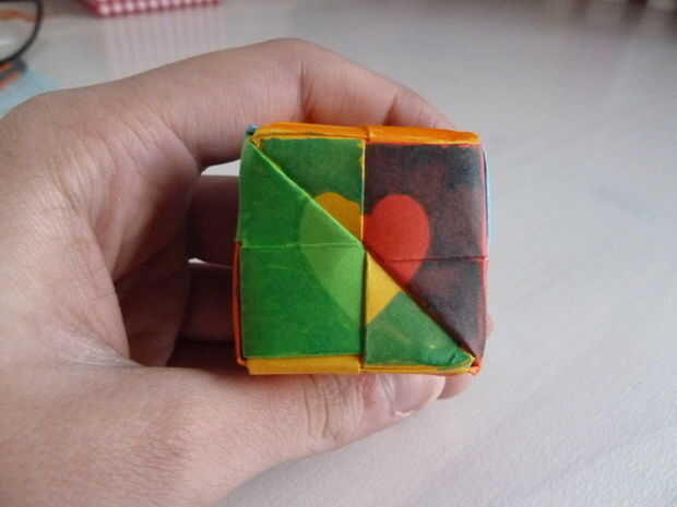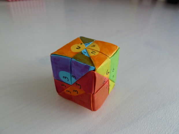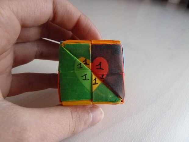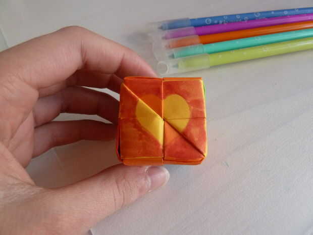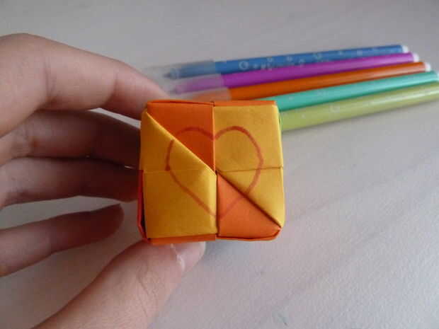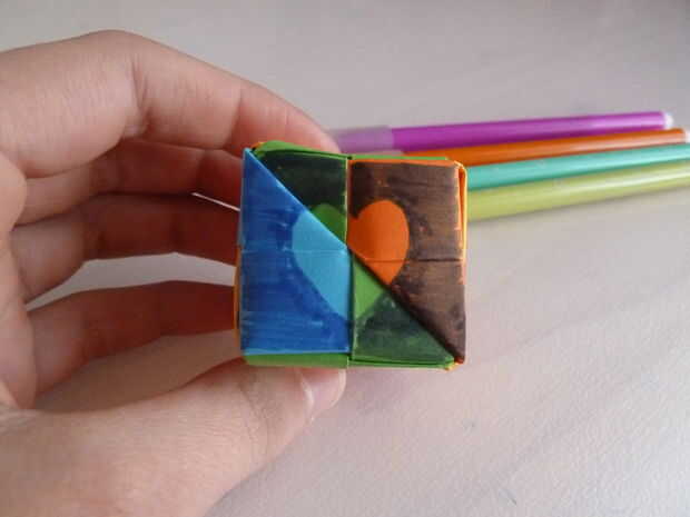 Por lo tanto, había doblado un cubo de prueba. Pero, cuando desplegarlo, yo sería capaz de decir qué parte era visible. Me dibujó un corazón y fuera de él con un marcador de diferente color en cada lado de color. Lo dibujé en forma de un corazón en vez de sólo para colorear, estaba debido al ángulo de las fotos. Cuando sólo hubiera coloreado lo, no habría sido posible decir qué lado estaba la parte superior de la parte de color. También escribí números en ellos: un número por cada lado. Estos son los números que también están incluidos en los archivos. La razón por la que agregó fue porque utilicé papeles de colores y marcadores de colores, y algunos colores diferentes miraban tanto.