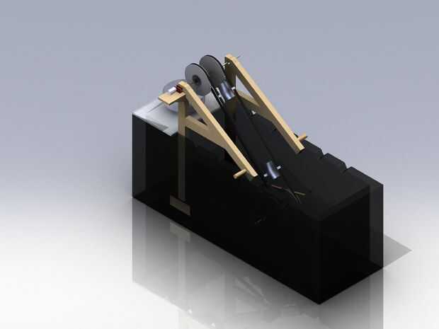 Tras generación de discusión, la investigación y la idea surgió con un concepto de cómo podríamos hacer un cubo y la cadena de la bomba que encajaría en el tanque siempre (foto abajo). Nuestra idea consistió en un sencillo marco de madera, dos correas y cinco contenedores de agua – equidistantly espaciados a lo largo del cinturón para máxima estabilidad. Una de las principales características de nuestro diseño fue un brazo ajustable que permite el sistema recoger agua en varios incrementos de gradiente, lo que significa que podría ser adaptado para satisfacer el nivel de agua del tanque. Aquí está una imagen de nuestro concepto (hecho en SolidWorks):