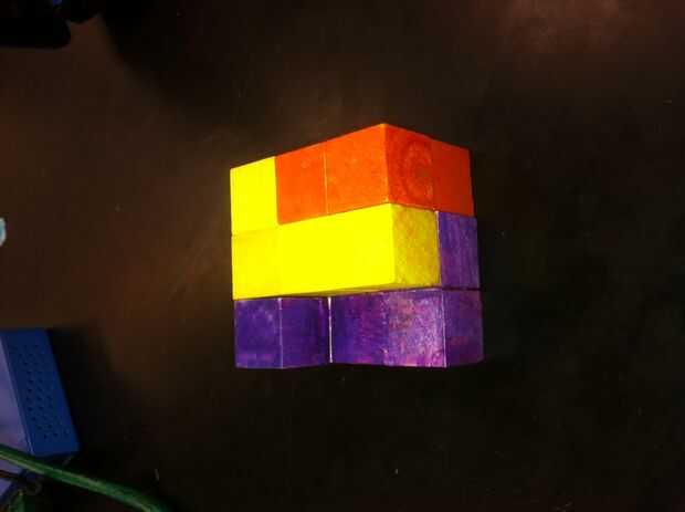 Luego coloque la pieza amarilla entre ellos por lo que la pieza amarilla sería un cuadrado con el pedazo de naranja y una línea con el trozo púrpura.