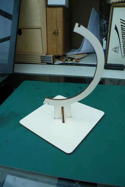 El stand consta de tres partes - una base cuadrada, el marco en forma de C y un refuerzo triangular cerca.