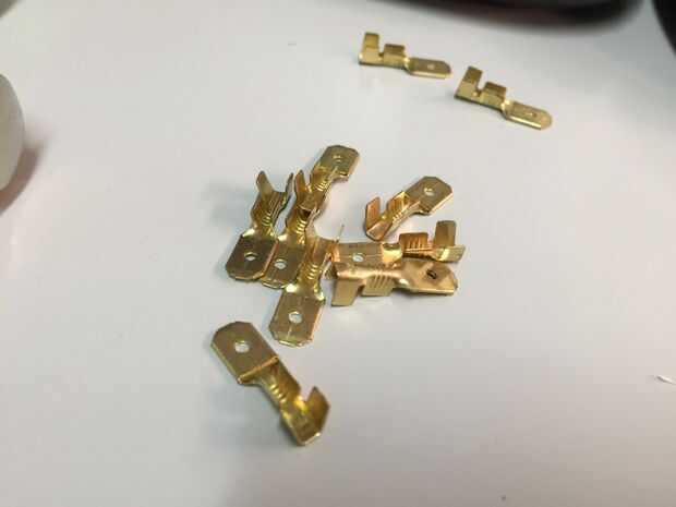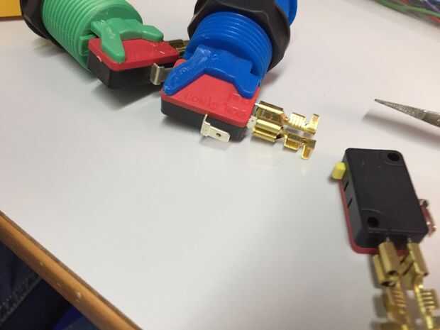 El siguiente paso es conseguir todos los pulsadores cableados, para este paso utilizamos los adaptadores la mostramos en las fotos, eran realmente útiles ya que nos evita problemas de cortocircuito en los terminales.