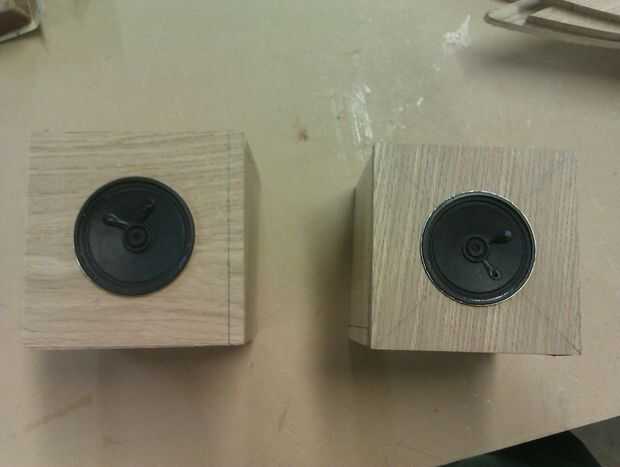 Después de los dos primeros habían pegado continué con el resto, hasta que quedó sólo la parte posterior. Antes de unirse a la parte trasera he quitado el bloque de madera y luego hizo el dowl conjunta. Poner la espalda en necesario colocar dos pinzas torpemente a través del agujero del cono de altavoz en el panel frontal, esto hizo que era cuadrada.