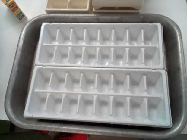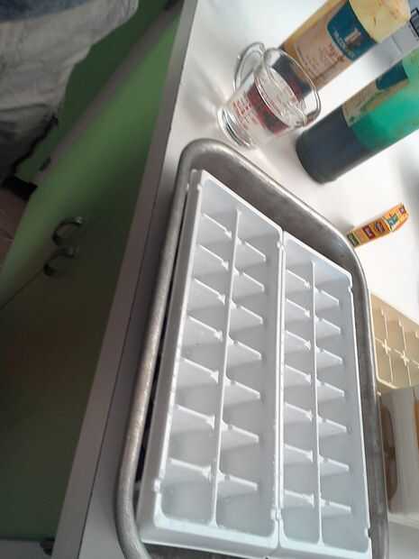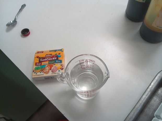Reunir fuentes: bandeja de hielo, taza Vierta el agua, el colorante y la sal para derretir el hielo