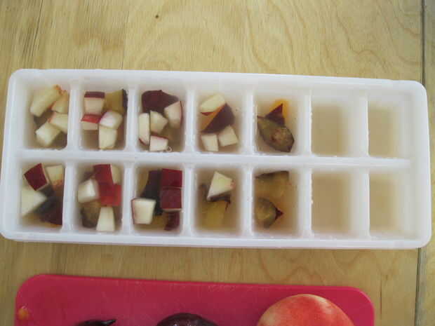 Distribuir sus cubos pequeños de frutas entre los agujeros del cubo de hielo, luego pop todo en el congelador.