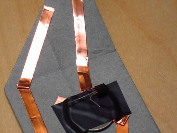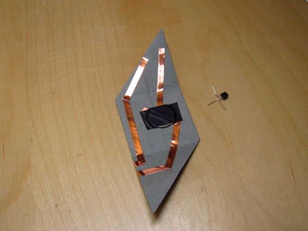 Tomar el transistor y ponerlo encima de la cinta negra, el lado plano hacia arriba. Asegúrese de que el primer tramo está tocando la primera cinta de cooper. Corte algunos cinta cooper y pegarlo en como en la imagen.