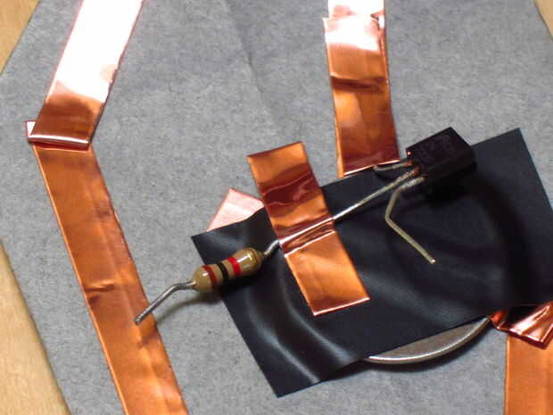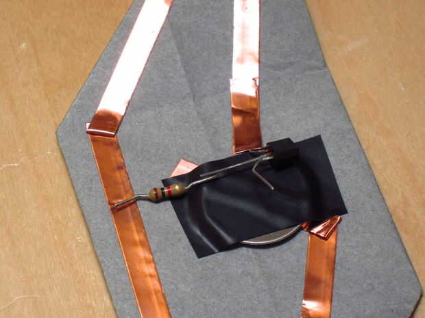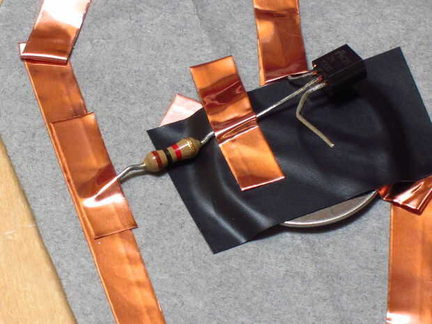 Poner la resistencia justo debajo de la segunda etapa del transistor, asegúrese de que las piernas tocan y parte inferior de la resistencia está tocando la tercera cinta de cooper. Cortar dos piezas de cinta de cobre a la resistencia del transistor y la parte inferior de la resistencia en la tercera cinta de cooper, como en la imagen.