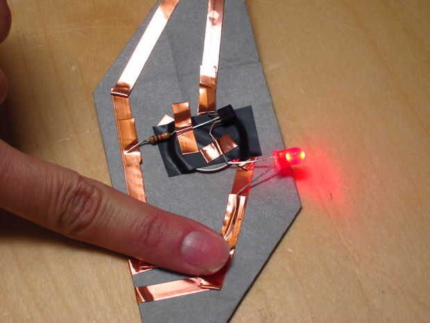 Por fin tenemos la magia. Toque la cinta de cobre de segunda y tercera al mismo tiempo para que la luz puede estar encendida. Para convertirlo de, tocar la cinta de cobre primera y tercera al mismo tiempo. Ver la imagen.