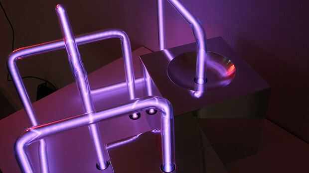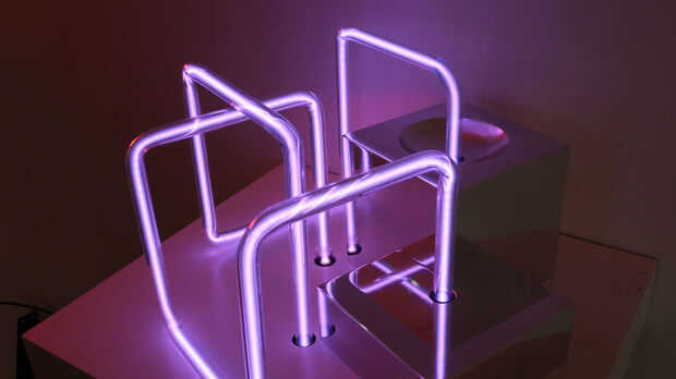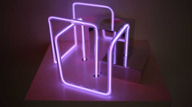Porque neón está definido por líneas, volúmenes pueden intersectar, causando los bordes para conectarse como si a través de la base. Líquido refrigerante explora cómo neón puede crear volumen a través de los bordes, mientras que ocupando el mismo espacio que el aluminio. Múltiples formas cúbicas surge a través de las muchas reflexiones de ángulo recto.