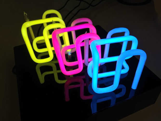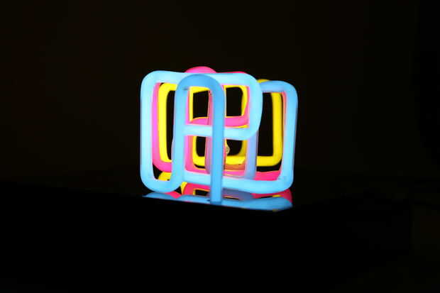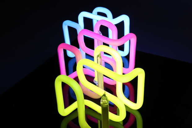 En Voxel, quise crear cubos exactos de neón. Precisión y neón a menudo no van juntos, pero la precisión es necesaria para transmitir una forma geométrica simple. Limitado por lo apretado que podrían ser las curvas y algunos prototipos en tubo de vidrio de 5mm, la forma finalmente llegó a ser una curva espacio-que llena. Muchos, muchos cubos rotos más adelante (de malo torpeza vidrio doblado y general), tres cubos en cian, magenta y amarillo vinieron a formar esta escultura.
