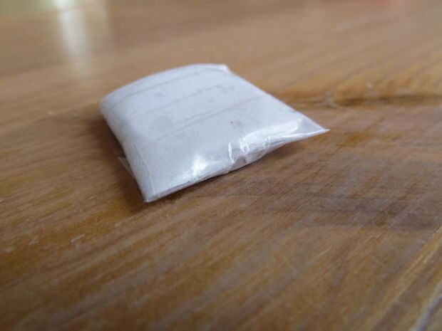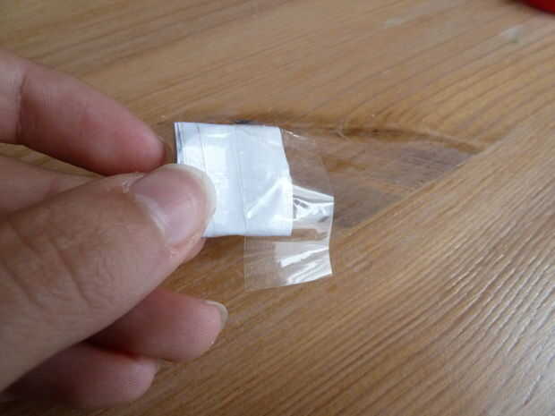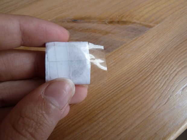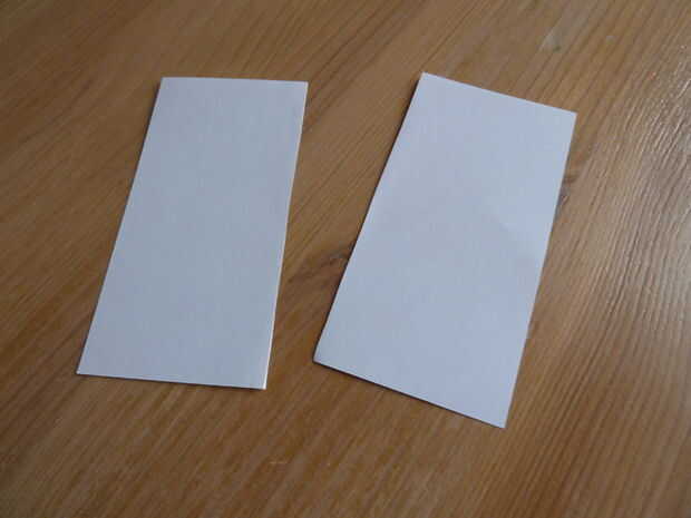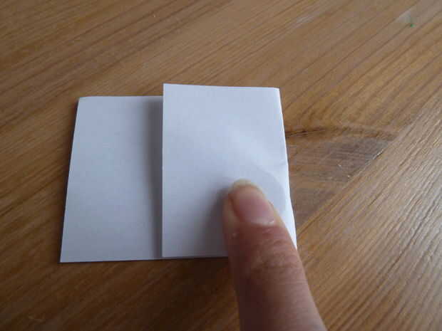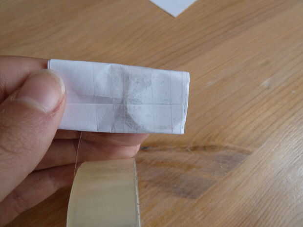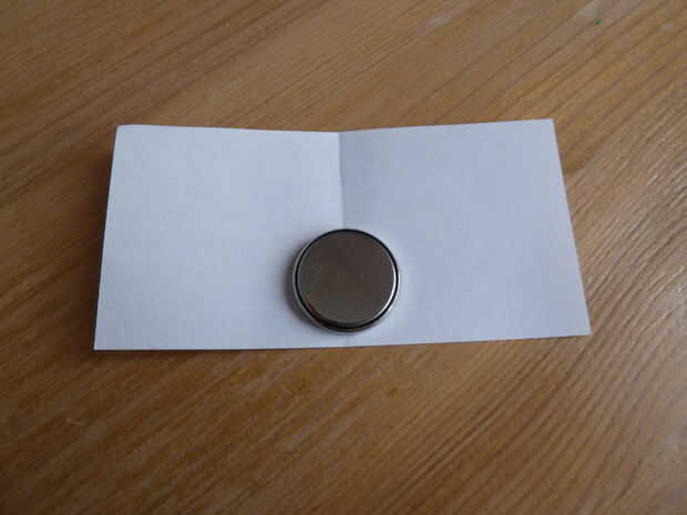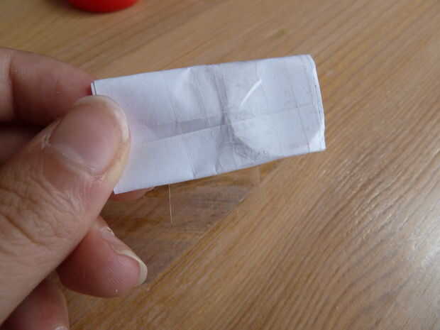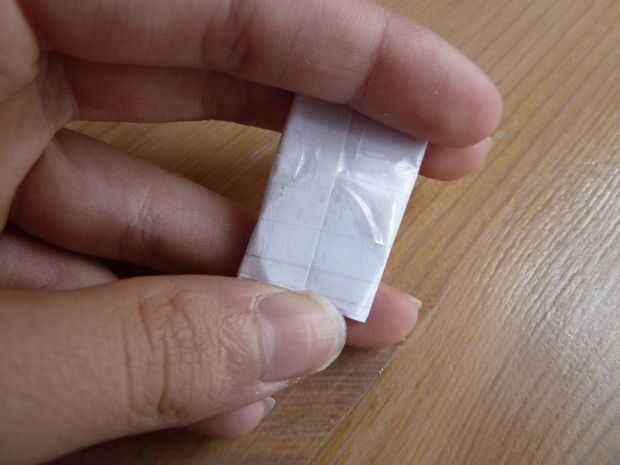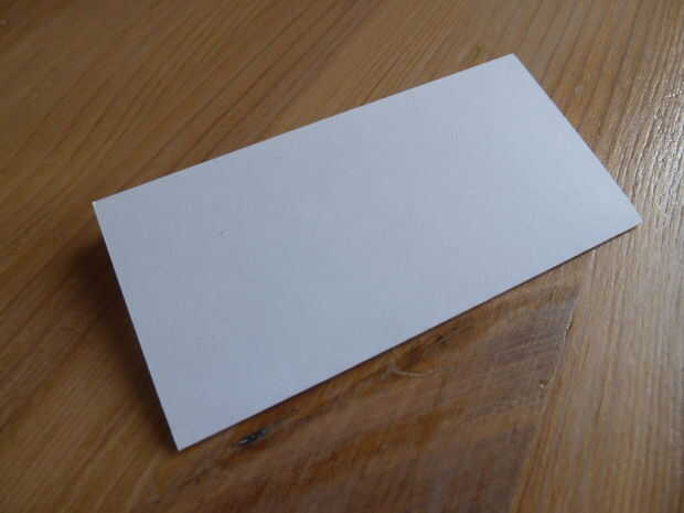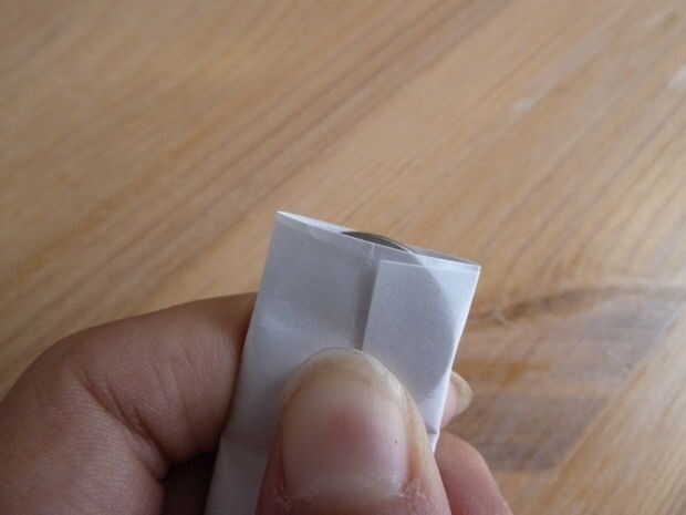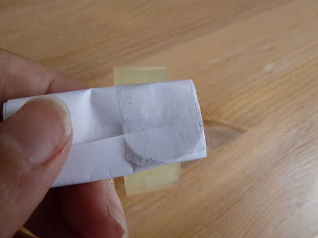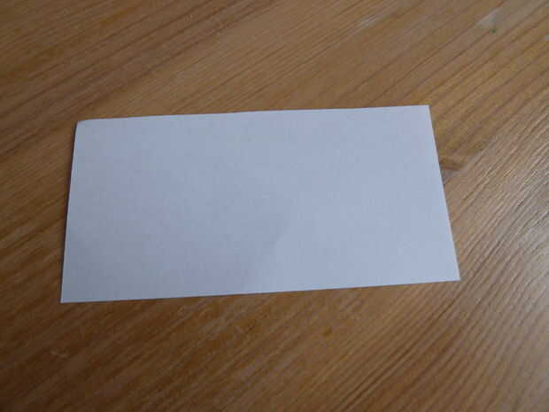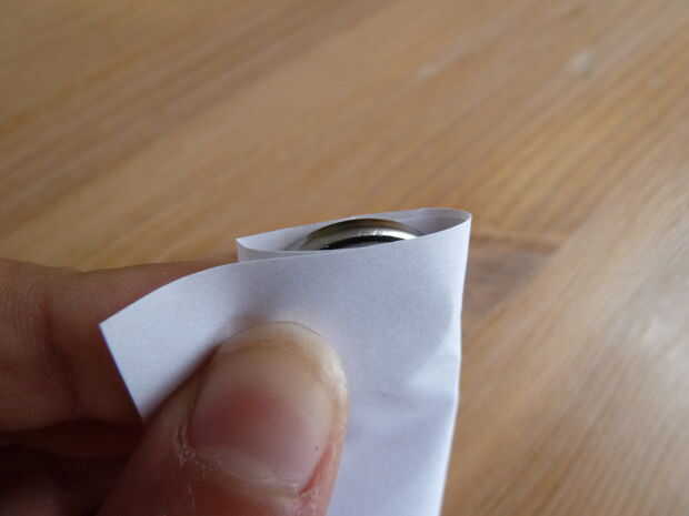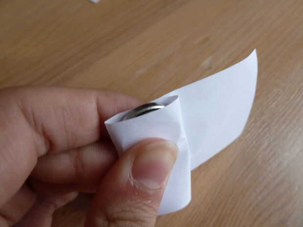 Tome su pedazo de papel blanco normal. He utilizado un papel de nota. Doblar por la mitad y cortar sobre el pliegue justo hecho. Tome una de las dos mitades y doblar por la mitad. Coloque la batería en ese pliegue y envuelva el papel alrededor de él como se muestra.