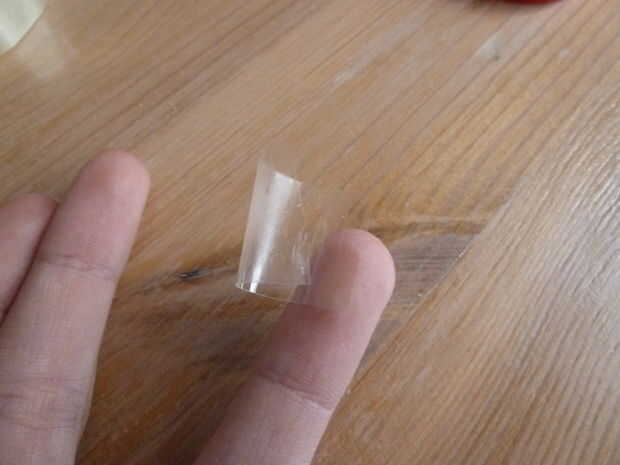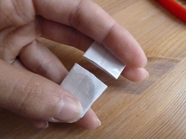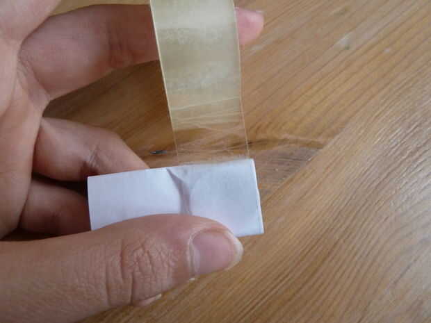 Cuando hayas hecho esto, tome su cinta adhesiva y cinta, cinta y cinta. Cortar la cinta y poner fin a su envoltura. Toma tus tijeras y corte el papel a la izquierda detrás de la batería. A continuación cortar un pice de la cinta y se usa para acabar con el soporte de la batería como se muestra.