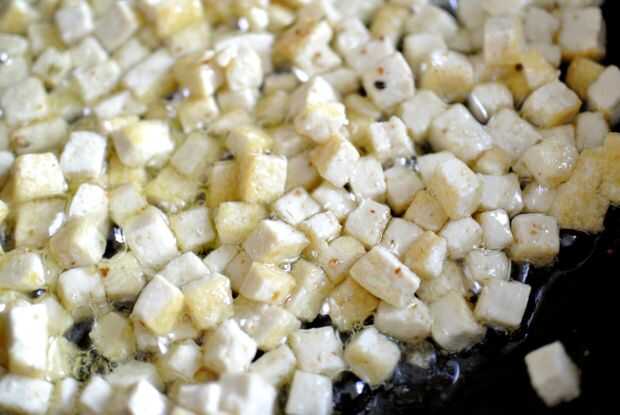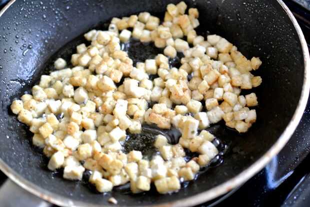 Estará listo cuando los cubos se han reducido a unos 3/4 de su tamaño original y que estén doradas uniformemente en el exterior.