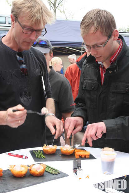 Poner el jugo de arándano rojo en un tazón, agregar media cucharada de lecitina de soja. Utilice una licuadora hasta que se forme una ligera espuma. Una vez que las copas estén listas, sacar una cucharada de espuma en el plato. Y terminado!