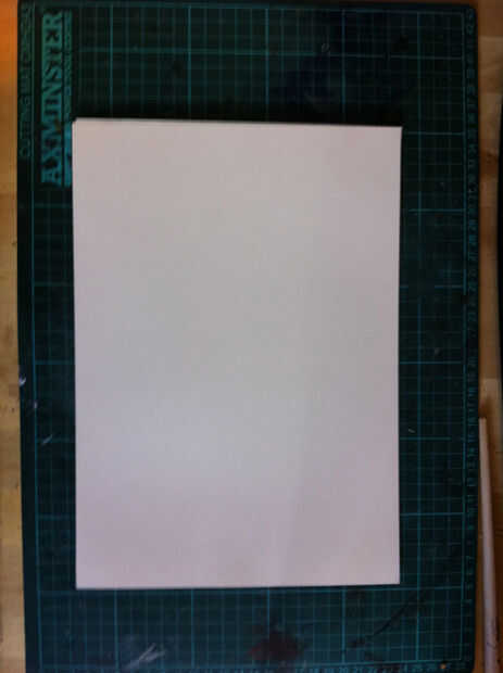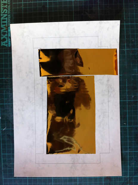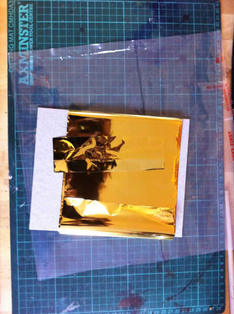 Una vez hecho esto en su lugar, cubrí la impresión hacia fuera y la lámina de oro con una hoja en blanco de papel, intercalando la lámina.