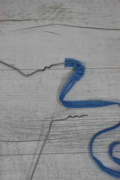 Desenrolle cuidadosamente la torcedura de la percha de alambre. Asegúrese de conservar la forma por lo que se puede volver a torcer más adelante. Pase la tira sobre el cable. Comience en el extremo del gancho. Mantener al mismo patrón de rosca (por ejemplo: más de 2 agujeros, debajo de 1 orificio). Pase a pocos centímetros de la estera, luego extendió esta sección a lo largo del alambre para crear espacio en el punto de partida. Luego un poco más del hilo de rosca y extenderlo a lo largo.