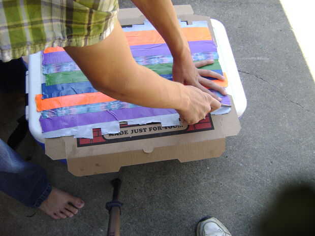 Cortar donde hay partes todavía pegajosas la izquierda. Debe ser en línea recta. Lo más probable es que vas a tener que limpiar el corte para hacerlo más recto, o para obtener pequeños trozos de cinta colgando que te perdiste, apagado. Luego voltear la hoja de la cinta y hacer los mismos cortes para los dos lados.