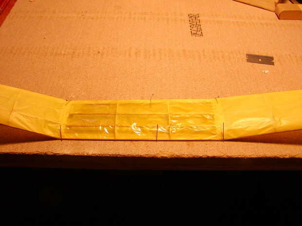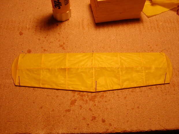 -En las superficies de vuelo, las alas y cola, para evitar deformaciones puso sobre la mesa de construcción les pin plano y deje que el tejido se seque antes de retirarlo.