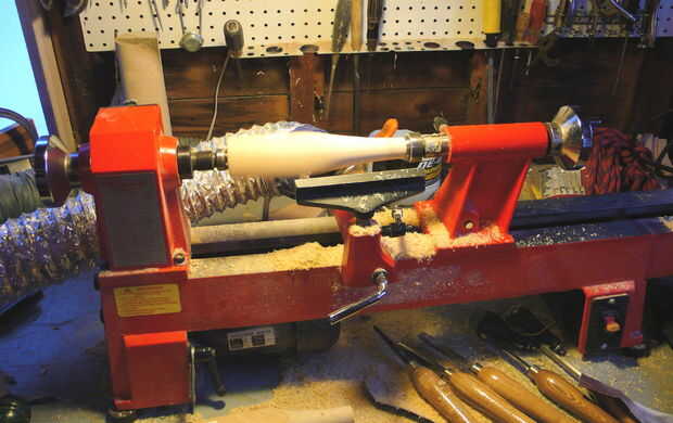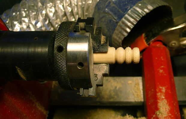 Marque el centro de las piezas de los extremos y colocar en el torno. Reducir a un punto que se ajuste en el aislador de vidrio El mandril de cambio y el gancho inferior del detalle