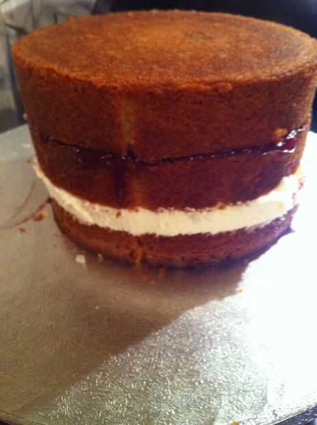 Relleno con crema de mantequilla y mermelada, tenga cuidado para asegurarse de que los bordes cortados en pastel de coincidir, de lo contrario obtendrá una tarta wonky