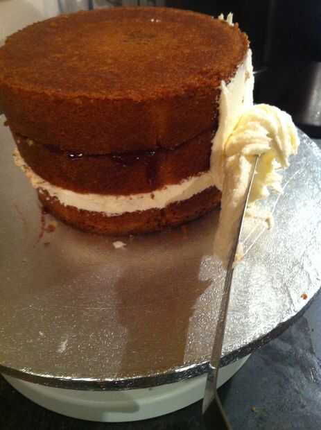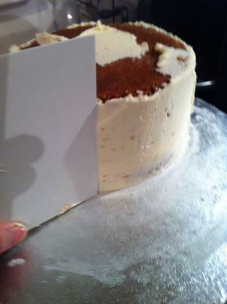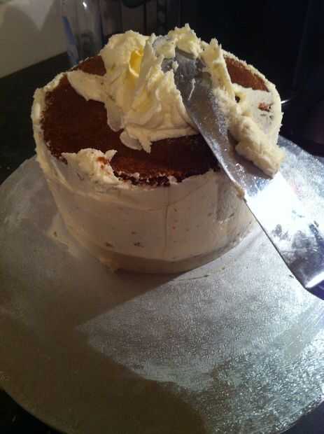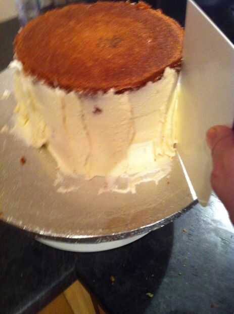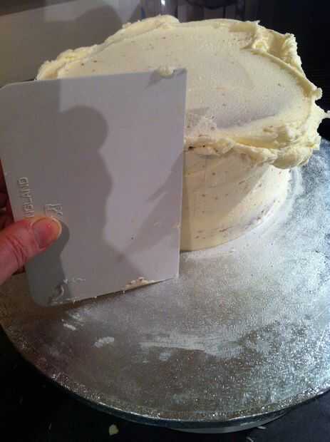 Utilice una espátula o cuchillo grande para cubrir torta de crema, usar más suave y tabla para pastel mientras que suavizar los lados de la vuelta