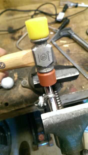 El extremo del martillo hacia abajo y por seguir golpeando. Como martillo, martillo el más cercano a las abrazaderas de tornillo. cuando lo tienes casi hecho, retire el mango y colóquela sobre el ya bennt lado y continuar.