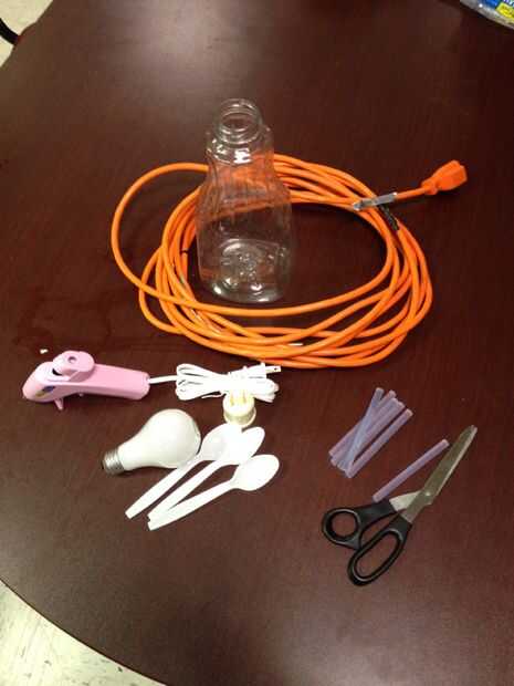por fin lo hice! Terminé mi lámpara! Todo lo que necesitas es un montón de cucharas (utilicé 270, 18 filas con 15 cucharadas de cada uno), plumas, pegamento caliente y una botella de plástico de 10L. Me corte el fondo de la botella y comencé a pegar