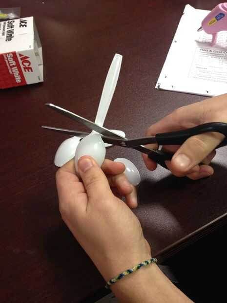 En primer lugar, conecte la pistola de pegamento caliente y usar tijeras para cortar los mangos de las cucharas.