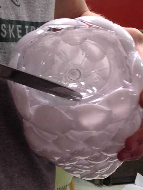 Crear un agujero en la parte inferior de la botella por dos agujeros y con unas tijeras. Asegúrese de que puede caber una bombilla por el agujero. Si lo desea, el agujero se puede hacer antes de pegar las cucharas en la botella.