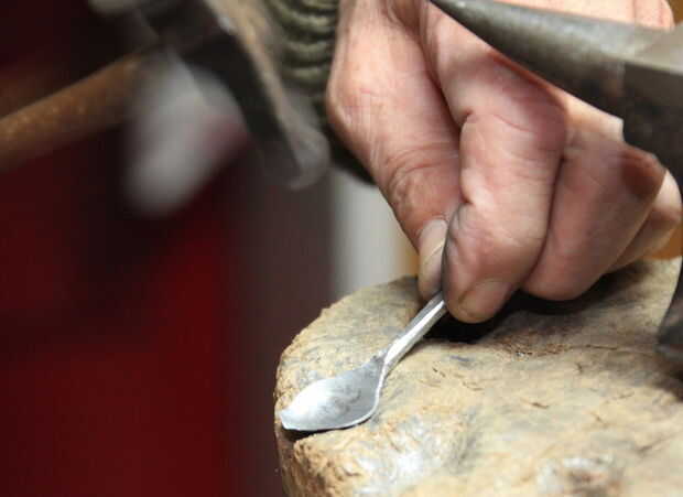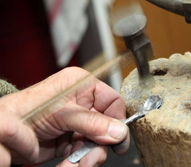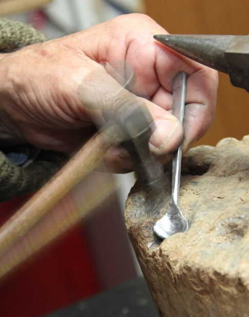 Ahora usar el martillo de cara redonda para profundizar en el tazón de fuente en una cavidad redondeada en un tocón.