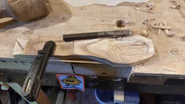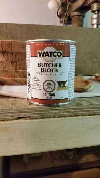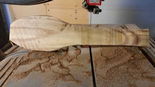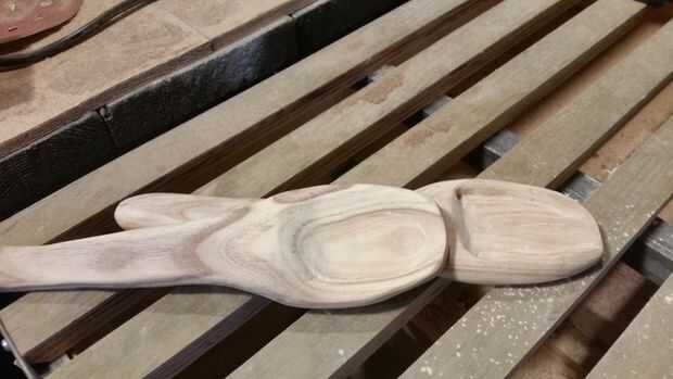 Con mi sierra de cinta corte 2 piezas de la longitud correcta, luego cortar las formas rugosas de las cucharas. Tiene que haber una manera más fácil de tallar las cucharas pero no sé por lo la mano talló los huecos con un martillo y cincel, luego utiliza mi tabla y 3/4" roundover broca para formar las manijas. Después de lijar de grano 220, usé Watco final de bloque de carnicero para sellar las cucharas