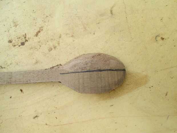 Iniciar la forma de la cuchara por trazar una línea por el centro de la espalda. Luego sujeta el caballo vio y tomó una escofina de madera en bruto en forma. Asalto sobre el borde de la línea central hacia para tazón de fuente de la cuchara dándole forma de cuchara. Las últimas fotos muestran una mitad de la espalda formada. Repito el proceso en el otro lado. En este paso es todavía ásperas, pero cerca de la forma final "cuchara".