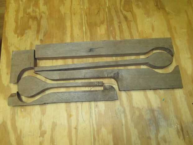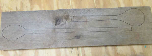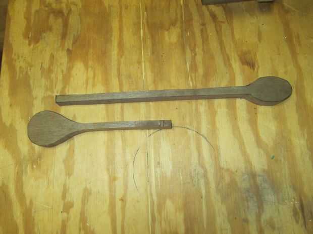 Presentado dos cucharas en el tablero. Pude poner cabo evitando los nudos y defectos. Había suficiente material para hacer dos cucharas y tuve una solicitud de mi hija para hacer un extra cuchara de mango largo. Ella es en conservas y las cucharas cortas son difíciles de colgar a una profunda olla llena de jugo de tomate.