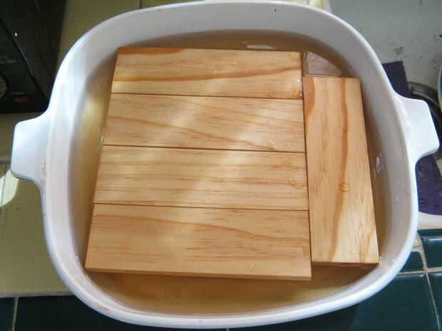 Aplicar una capa de aceite de linaza hervido para cada segmento de madera y los segmentos a 300 ° F dentro de un horno de calor. Esto hará que el aceite de linaza hervido curar parcialmente. Mientras esté todavía caliente, quitar los segmentos, límpielos y repita 2-3 veces más. Después de la última vez que la madera fresca. Aplicar cera en pasta para que la madera ya no está pegajosa. Disolver la capa de dextrina para exponer la cara superior colocando la madera en agua. Use una almohadilla de fregado para acelerar el proceso. Cuando termine, limpie y deje que la madera seca en unas horas.