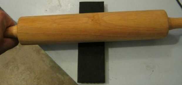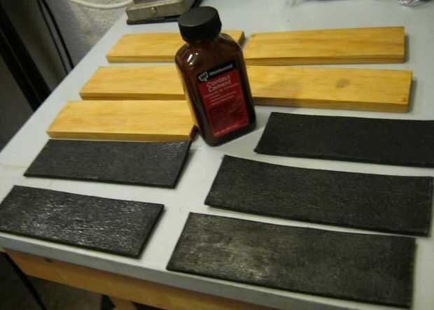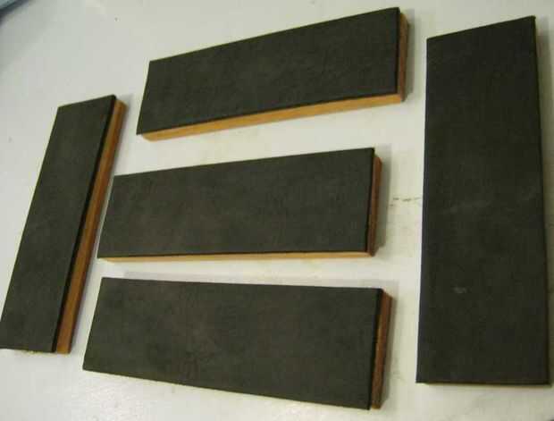 En este paso, se unen los segmentos de madera y correa. En primer lugar, lijar la cara superior de la madera. Aplique cemento de contacto a la cara de tapa de arena y a la cara más áspera de los segmentos de banda. Espere 10 minutos para que el pegamento se seque antes de pegar las dos piezas juntas, cemento de contacto es inusual en que tiene que secarse antes de que se une. Utilice un rodillo para la firme adherencia entre la correa y la madera.